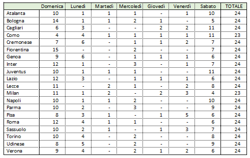 Nelle tabelle allegate sono riportati i giorni e gli orari delle prime 24 giornate di campionato (ad eccezione di Milan-Como, rinviata a data da destinarsi, ndr). Numeri alla mano, ognuno può farsi la propria idea. Una cosa, però, appare piuttosto chiara: le disparità sono evidenti. Il primo dato che balza all’occhio riguarda proprio il Pisa. La squadra nerazzurra si appresta a disputare la quinta partita di venerdì, un numero che colpisce se confrontato con quello di altre squadre: ben otto club, infatti, non sono mai stati chiamati a giocare in questo giorno della settimana.