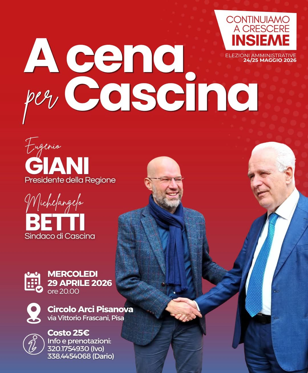 Per informazioni e prenotazioni è possibile contattare Ivo al 320.1754930 oppure Dario al 338.4454068. Il costo della cena è di 25 euro.
