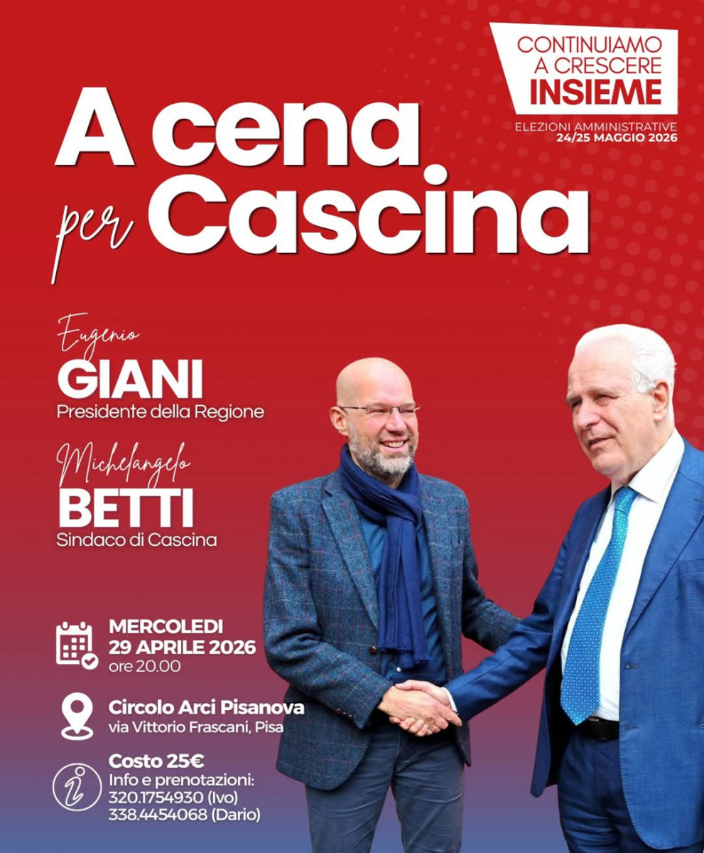 Un momento di incontro, confronto e rilancio dell’impegno politico per la città. Mercoledì 29 aprile, alle 20, al Circolo Arci Pisanova di Pisa, si terrà “A cena per Cascina”