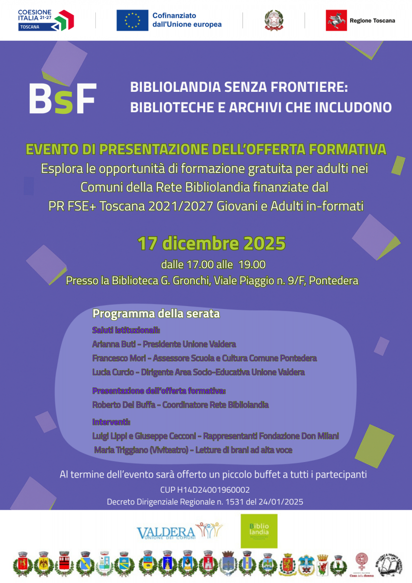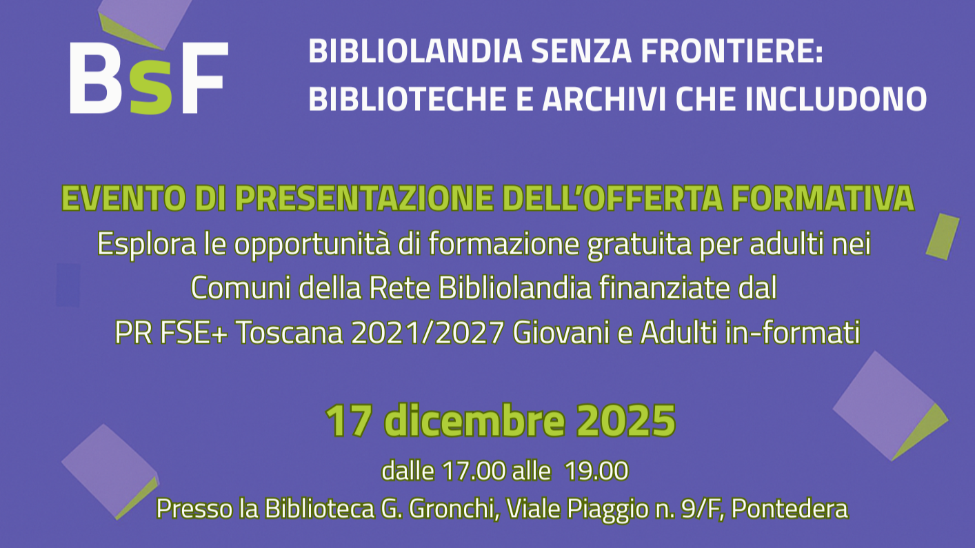 Mercoledì 17 dicembre 2025 alle ore 17.00 presso la Biblioteca G. Gronchi di Pontedera (Viale Piaggio n. 9) si terrà l'evento di presentazione dell'offerta formativa del progetto "Bibliolandia Senza Frontiere: biblioteche e archivi che includono", un'iniziativa che offre gratuitamente opportunità di crescita personale e professionale a cittadine e cittadini.