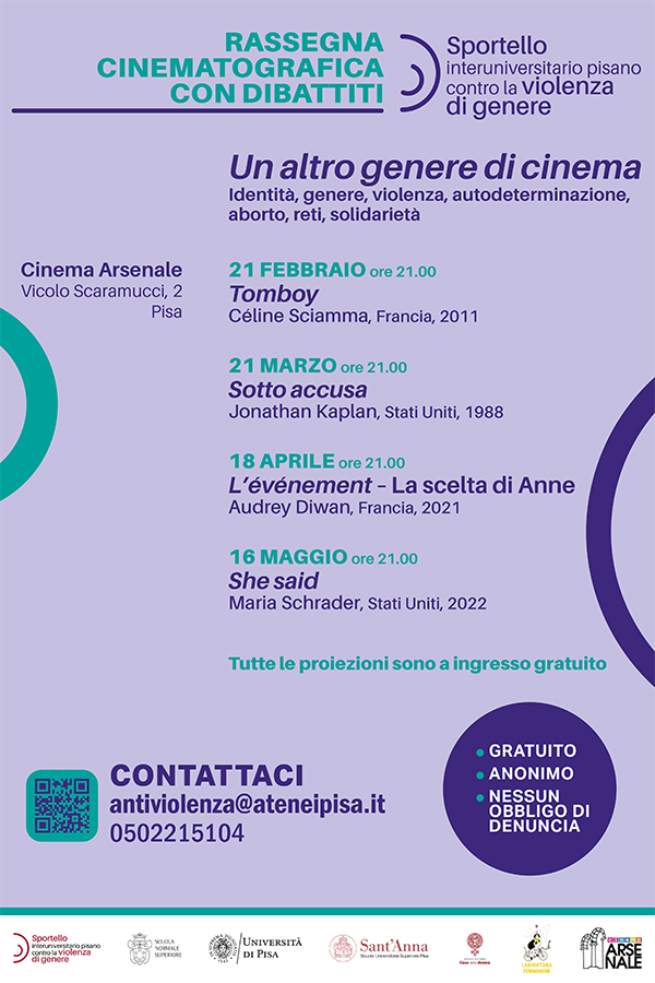 Si comincia il 21 febbraio con “Tomboy” (84′, Francia, 2002) di Céline Sciamma. Gli altri appuntamenti sono il 21 marzo con “Sotto accusa” di Jonathan Kaplan (Stati Uniti, 1988); il 18 aprile con “L’événement ?C La scelta di Anne” di Audrey Diwan (Francia, 2021); e il 16 maggio con “She said” di Maria Schrader (Stati Uniti, 2022). Al termine delle proiezioni animeranno i dibattiti esponenti dei comitati Unici di Garanzia dei tre atenei pisani e di varie associazioni, a cominciare il 21 febbraio con PinkRiot Arcigay Pisa, LGBTIQ+ Pisa e GenderLens e quindi per le altre serate Casa della Donna Pisa, Obiezione Respinta, Consultorio AIED Pisa, Associazione Italiana per l’Educazione Demografica, Collettivo Amleta e Non Una Di Meno Pisa.
