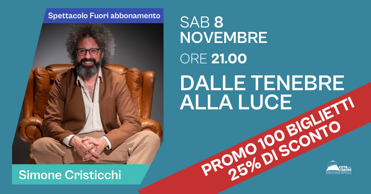 Un’occasione speciale per gli amanti della musica d’autore: La Città del Teatro di Cascina offre 100 biglietti con il 25% di sconto per il concerto di Simone Cristicchi “Dalle tenebre alla luce”, in programma sabato 8 novembre alle 21.