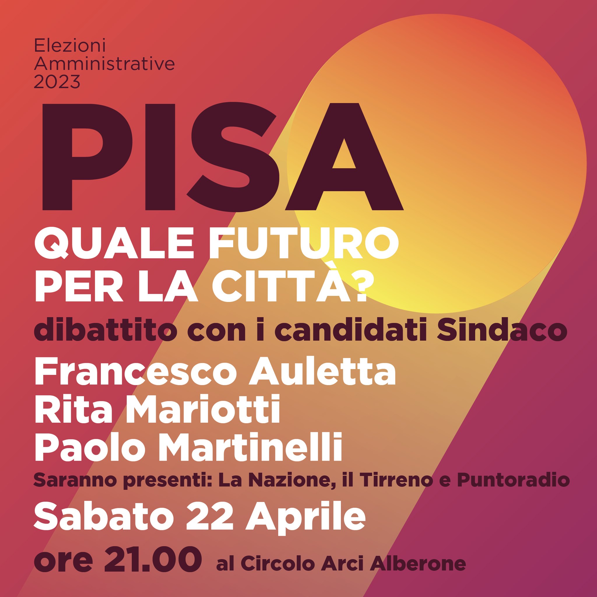 Si svolgerà al Circolo ARCI Alberone, il 22 aprile, il consueto incontro e dibattito tra candidati sindaci del mondo progressista e della sinistra svolto da ARCI Comitato di Pisa