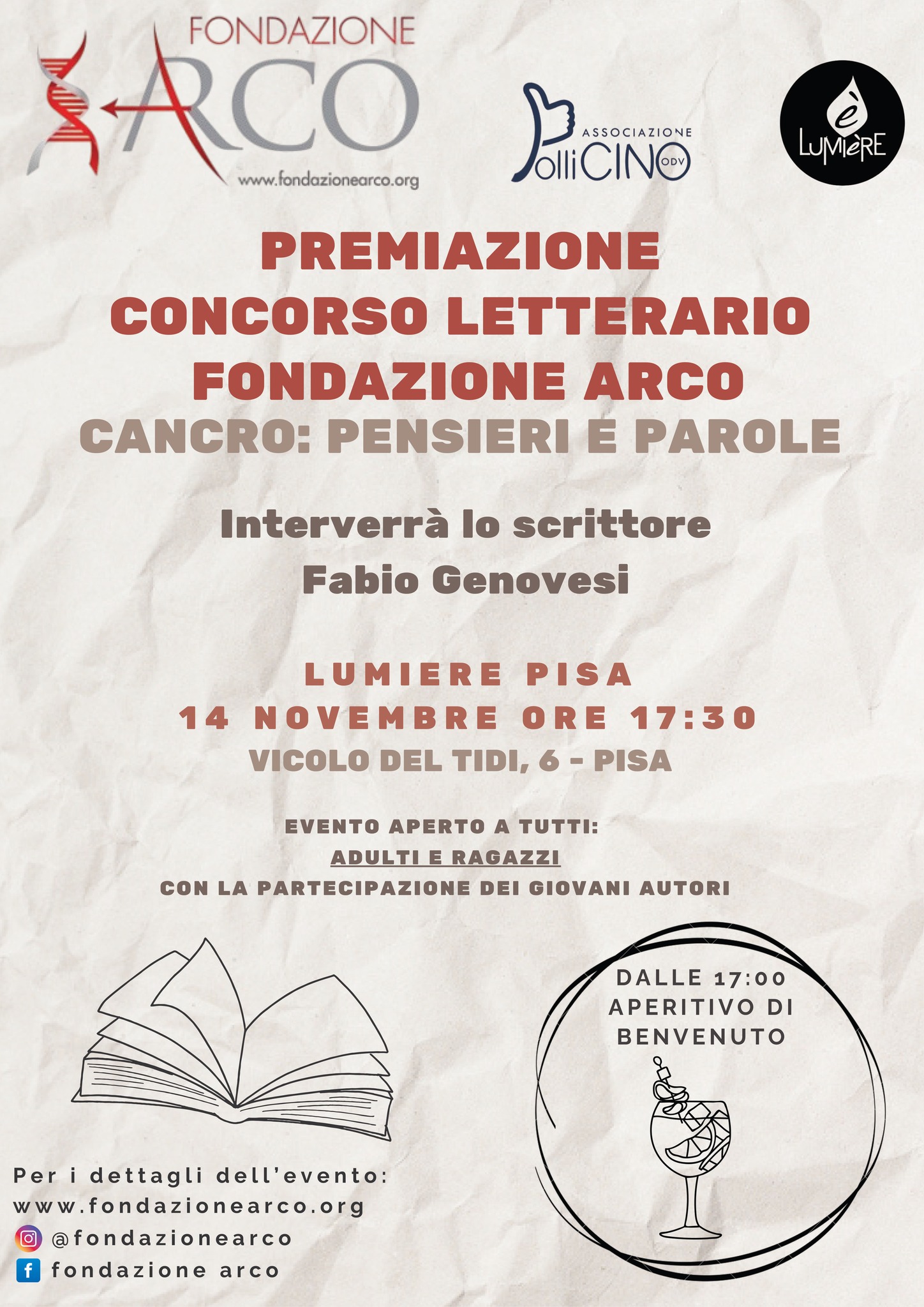 Si terrà venerdì 14 novembre alle 17, al cinema Lumière di Pisa, la cerimonia di premiazione del concorso letterario “Cancro: pensieri e parole”, promosso dalla Fondazione Arco in collaborazione con l’associazione Pollicino ODV e il Cinema Lumière, con il patrocinio della Regione Toscana.