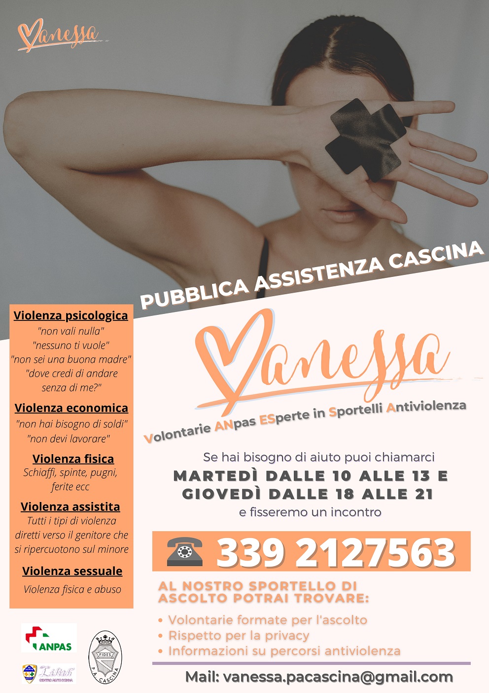 É nato presso la Pubblica Assistenza di Cascina lo sportello di ascolto dedicato alla violenza di genere. Lo sportello fa parte del progetto Vanessa, acronimo di “Volontarie ANpas ESperte in Sportelli Antiviolenza”