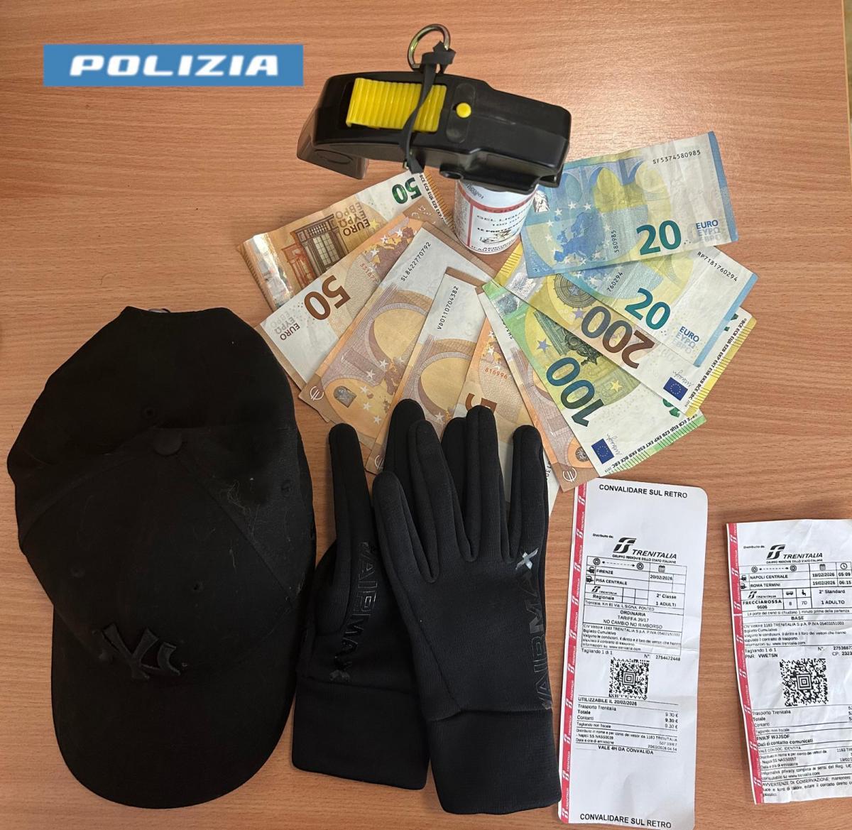 Fermato e perquisito, il diciannovenne – richiedente asilo formalmente assegnato a un centro di accoglienza di Napoli ma di fatto senza fissa dimora – è stato trovato in possesso di parte della refurtiva, tre telefoni cellulari, spray urticante al peperoncino e i biglietti ferroviari che confermavano la sua partenza da Napoli alle 4 del mattino dello stesso giorno.