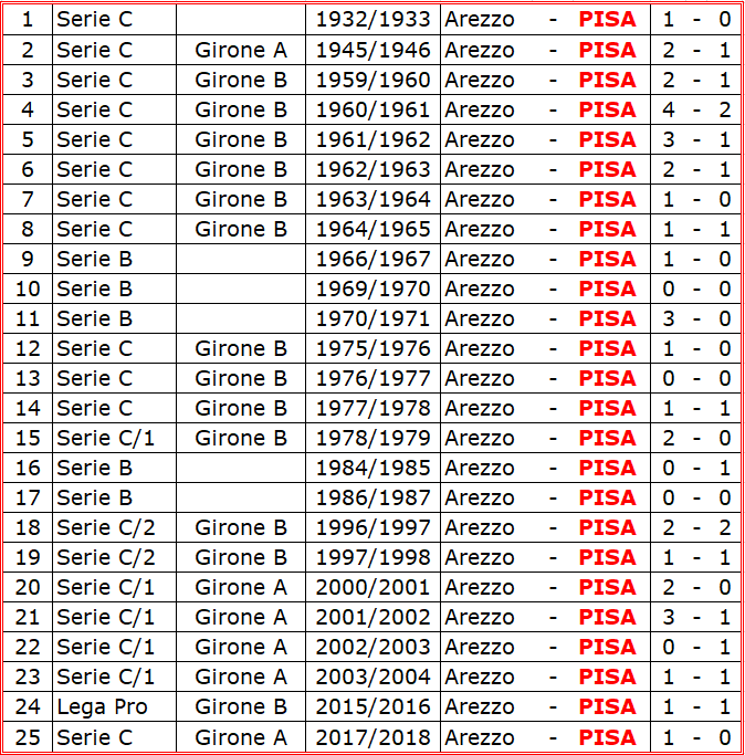 In tema di precedenti i numeri non sono incoraggianti: nelle 25 sfide disputate allo Stadio Città di Arezzo il Pisa è uscito vincitore soltanto in due circostanze; 9 sono stati i pareggio, l’ultimo 1-1 nella stagione 2015/2016 con rigore di Ricci, e ben 14 le sconfitte.