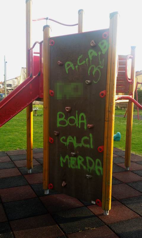 Dalla propria pagina Facebook il Sindaco di San Giuliano Sergio Di Maio denuncia una pratica dura a morire: quella delle scritte con le bombolette spray. Questa volta ad essere presi di mira sono stati i giochi per bambini ad Asciano, imbrattati come vedere dalla foto a fianco (abbiamo criptato volutamente la bestemmia) con della vernice verde.