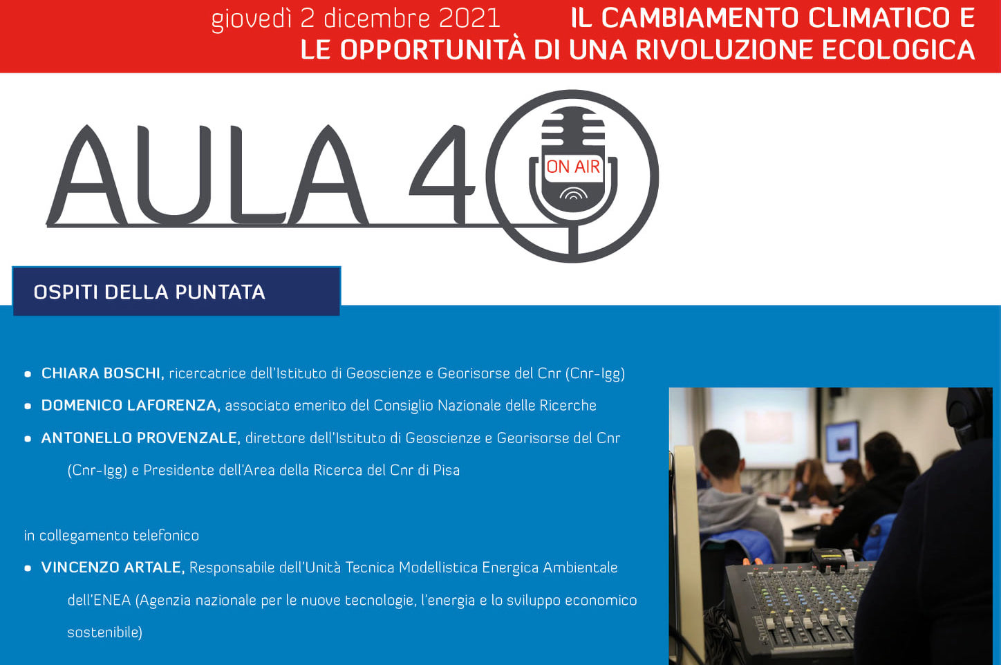 Alla lotta al cambiamento climatico è dedicata la puntata del 2 dicembre di Aula 40. Dalle 9.30, insieme ai nostri ospiti in studio e in collegamento telefonico, parleremo anche di come la ricerca scientifica può aiutare questa transizione ecologica. Seguiteci su Punto Radio (Fm 91.1-91.6) e in streaming sul canale Youtube della Web Tv dell’Area della Ricerca del Cnr di Pisa (https://www.youtube.com/channel/UC1vIEBWtn9HQxy4JofTvHCg).