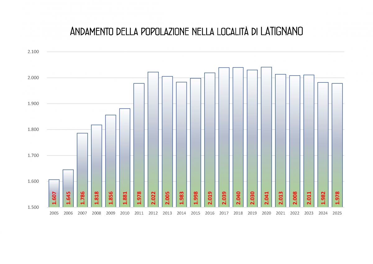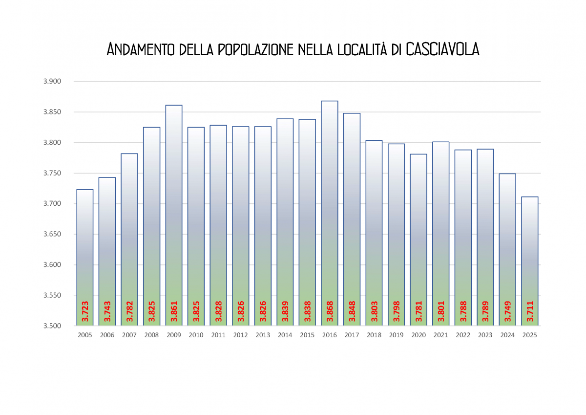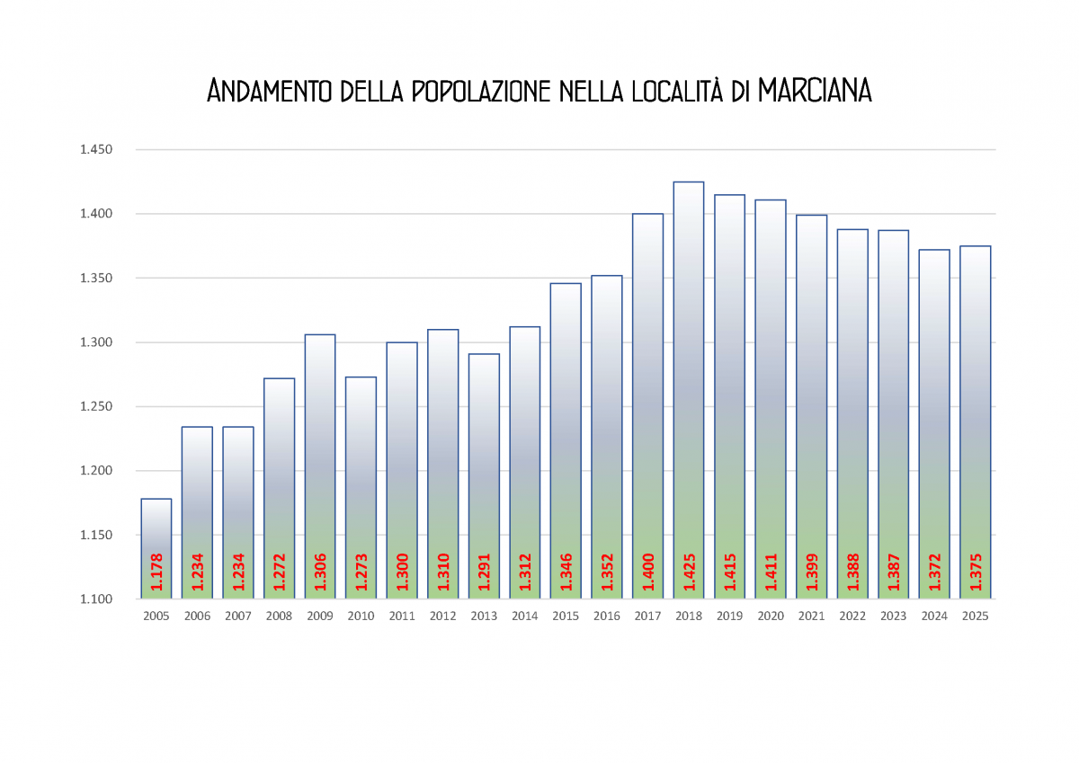 Qui sotto possiamo vedere l’andamento storico della popolazione nelle località di Casciavola, Cascina, Latignano e Marciana.