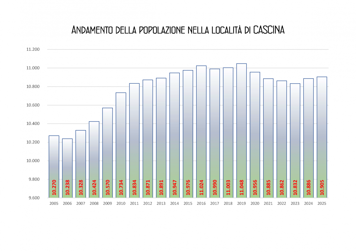 Un dato importante nell’analisi dei dati demografici rilasciati dal Comune di Cascina è quello relativo al movimento migratorio nell’ultimo decennio: dal 2016 al 2025 c’è stato un incremento di 15.578 nuovi iscritti (a fronte di 14.128 cancellati), praticamente all’interno del Comune di Cascina è cambiato un terzo dei residenti.