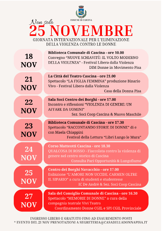 Le prime due iniziative in calendario fanno parte del Festival Liberə dalla Violenza e si terranno il 18 novembre alle 10.00 in Biblioteca Comunale P.Impastato con il Convegno “Nuove Schiavitù: il volto moderno della Violenza” a cura di DIM Donne in Movimento Pisa e il 21 novembre a la Città del teatro alle 21.00 con lo spettacolo “La Figlia Femmina” produzione Binario Vivo organizzato dalla Casa della Donna Pisa. Per quest'ultimo spettacolo è necessaria la prenotazione a segreteria@casadelladonnapisa.it