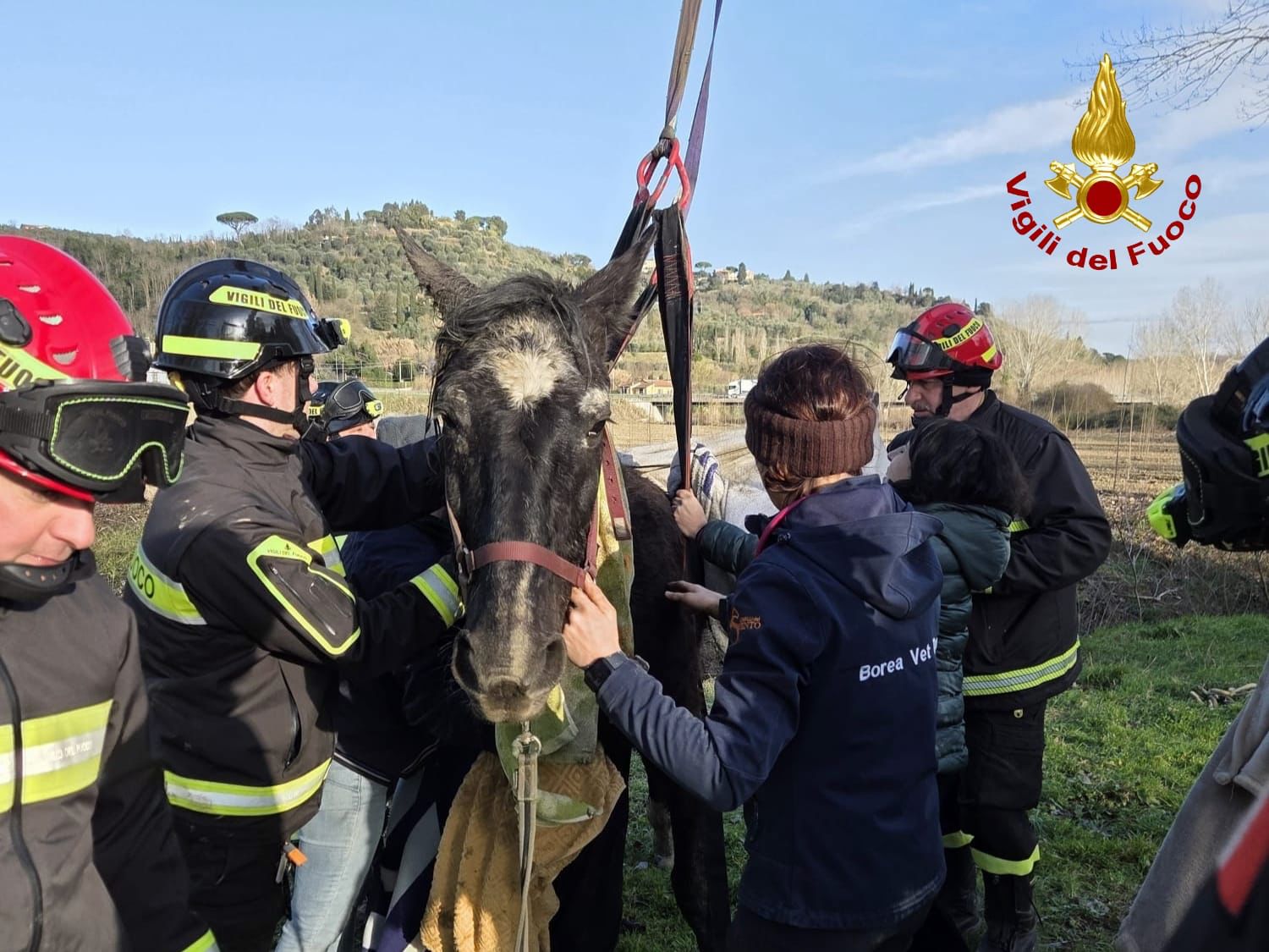 I Vigili del fuoco hanno utilizzato apposite fasce di sollevamento e l’autogru proveniente dalla sede centrale di Pisa per effettuare le manovre in sicurezza. Grazie all’azione coordinata, il cavallo è stato rialzato e successivamente trasferito in una zona più sicura.