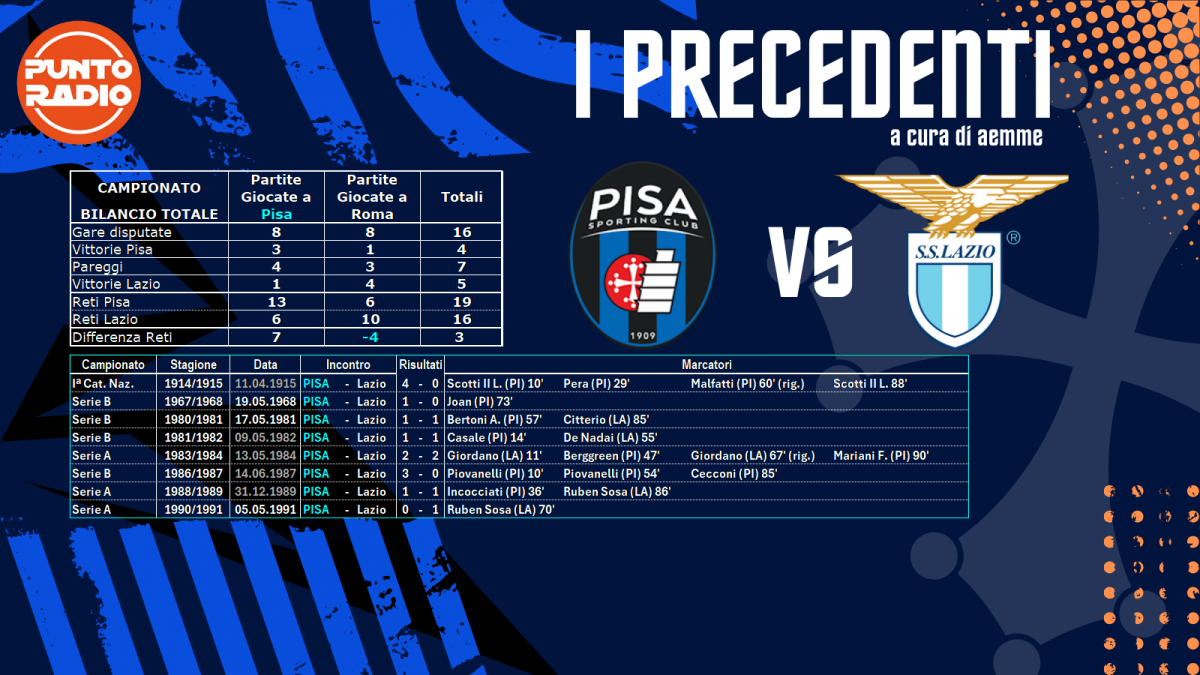Otto volte Pisa e Lazio si sono affrontate all’Arena: quattro volte nella massima serie, altrettante in Serie B. Il Pisa ha vinto in tre occasioni, l’ultima però nell’ormai lontano 1987, 3-0, grazie alle reti di Piovanelli (2) e Cecconi; quattro volte ha pareggiato ed una sola volta ha perso, volta che coincide con l’ultima in cui le due squadre si sono affrontate: era il 5 maggio 1991 e fu Ruben Sosa a decidere la partita.