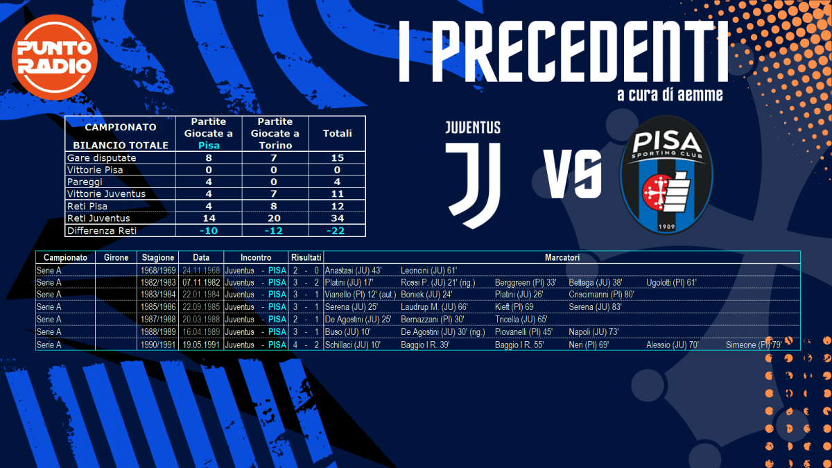 Sette precedenti a Torino, sette sconfitte, bilancio impietoso per Pisa che debutterà allo Stadium. L'ultima volta che le due squadre si sono affrontate era la stagione 1990/91, si giocò al defunto Delle Alpi e finì 4-2 per i bianconeri.