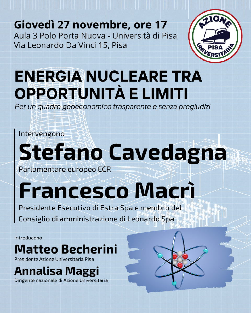 “Il ritorno dell’energia nucleare è oggi uno dei temi più rilevanti nel dibattito economico, industriale e ambientale in Italia. Ma il nostro Paese è davvero pronto ad affrontare questa possibile svolta? Rispondere in modo serio, documentato e senza pregiudizi è l’obiettivo del convegno che si terrà giovedì 27 novembre alle ore 17 presso l'aula 3 del polo Porta Nuova, organizzato da Azione Universitaria all’Università di Pisa e intitolato ‘Energia nucleare tra opportunità e limiti. Per un quadro geoeconomico trasparente e senza pregiudizi’.”