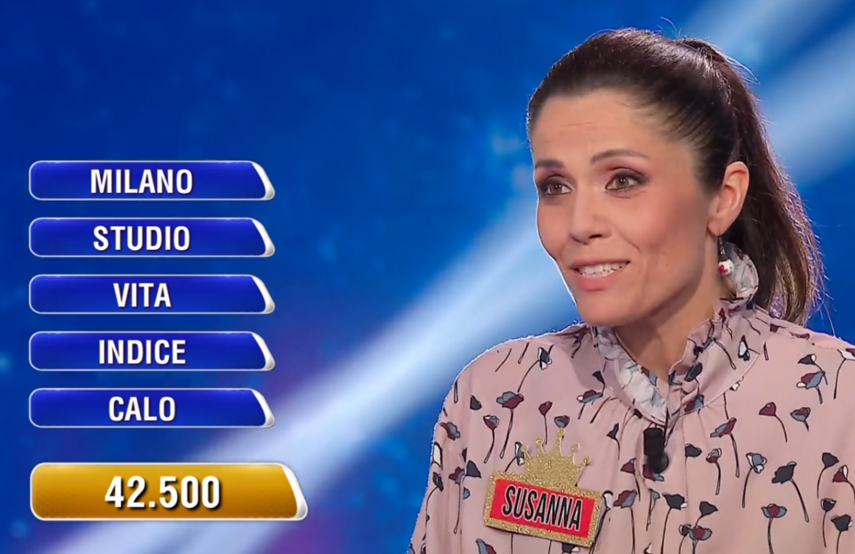 A quel punto, bisognava trovare una parola che legasse tutti gli indizi: Milano, Studio, Vita, Indice e Calo. Susanna non ha avuto dubbi e ha scritto “borsa”, motivando con lucidità: la Borsa di Milano, la borsa di studio, il modo di dire “la borsa o la vita”, l’indice di borsa e il calo della borsa.