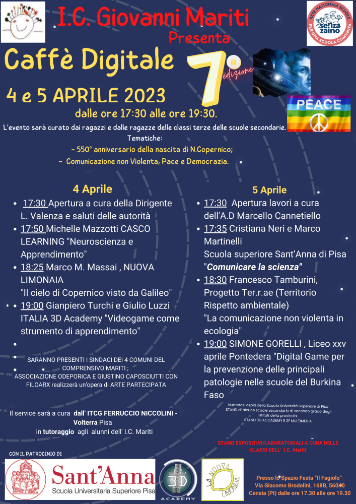 L'istituto comprensivo Giovanni Mariti di Fauglia presenta la 7a edizione del Caffè Digitale, che si svolgerà il 4 e 5 aprile dalle ore 17.30 alle ore 19.30, presso lo Spazio Festa Polivalente “Il Fagiolo” a Cenaia, via Giacomo Brodolini.
