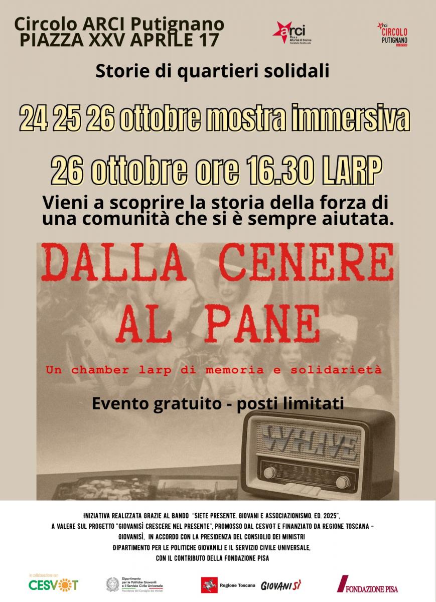 "Dalla Cenere al Pane” è un chamber larp (Live Action Role Playing) immersivo, un’esperienza corale che unisce storia locale, memoria collettiva e interazione diretta, il 26 ottobre