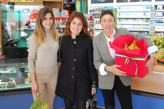Ceccardi e Favale hanno fatto omaggio di un mazzolino di mimosa anche alle donne che sono impegnate nelle attività commerciali del centro storico di Cascina.