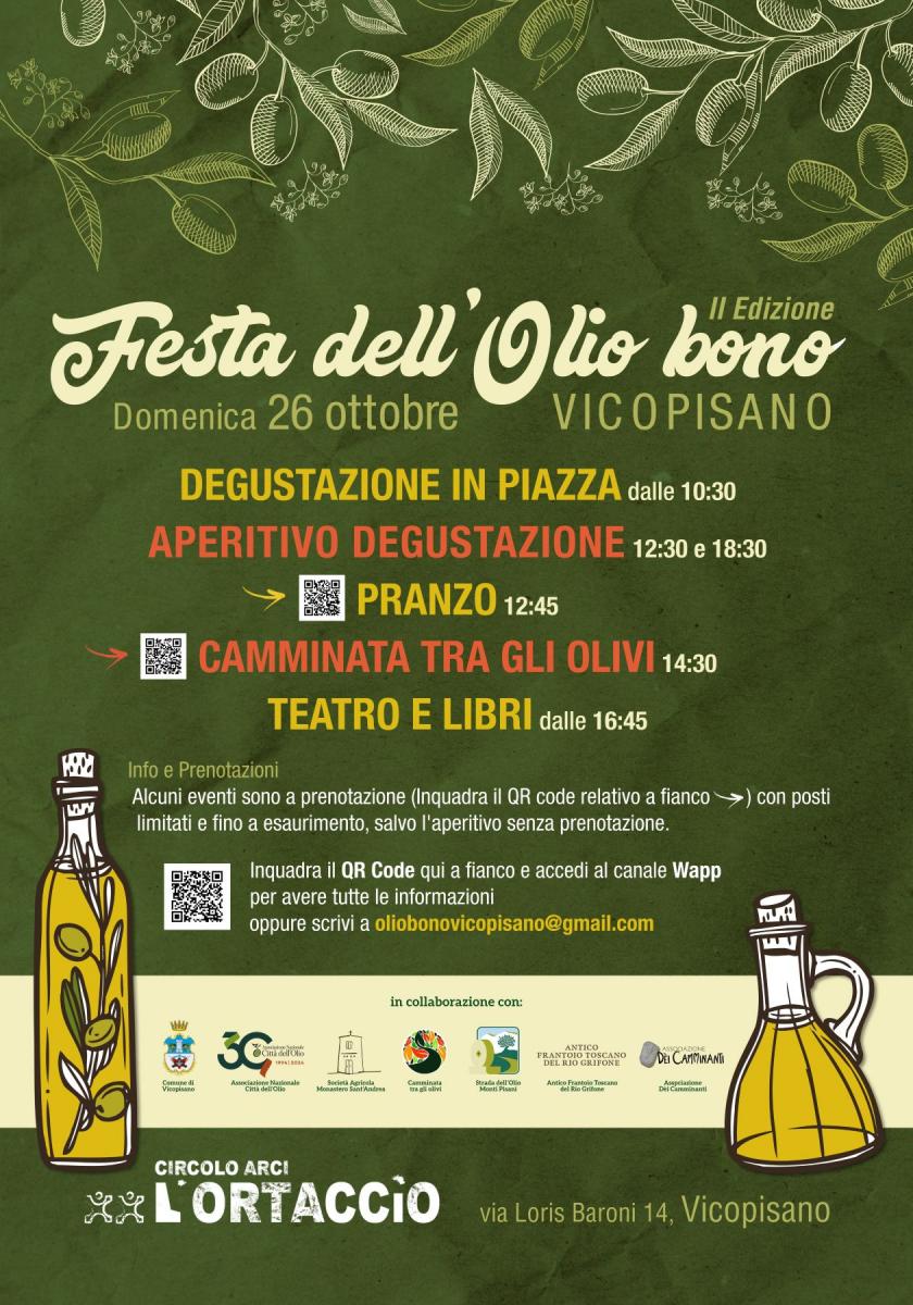 Domenica 26 ottobre torna la Festa dell’Olio Bòno di Vicopisano, seconda edizione della manifestazione promossa dal Circolo Arci L’Ortaccio di via Loris Baroni. Un’intera giornata dedicata all’Olio Extra Vergine d’Oliva nuovo e alle tradizioni legate alla sua produzione.