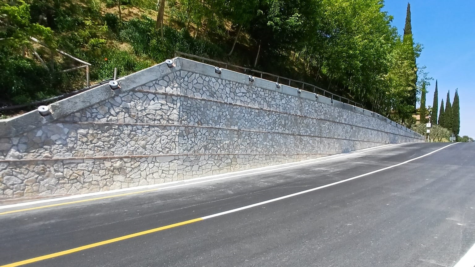 "Nel lotto 4, inoltre, si è realizzata una prima parte della sistemazione del movimento franoso attraverso palificate in micropali e pali a grande diametro, entrambi con tiranti di ammorsamento e consolidamento, nel rispetto dell'ambiente circostante. Il muro di controripa è stato completamente rivestito in pietra e ricorsi in mattone, nel rispetto delle tipologie già presenti in zona.