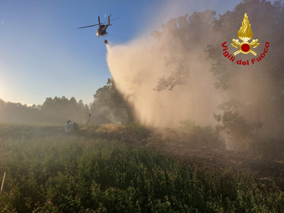 Massiccio intervento ieri pomeriggio, giovedì 30 giugno, dei Vigili del fuoco, arrivati sul luogo del rogo con 5 diversi mezzi, 11 operatori e un elicottero con base a Cecina.