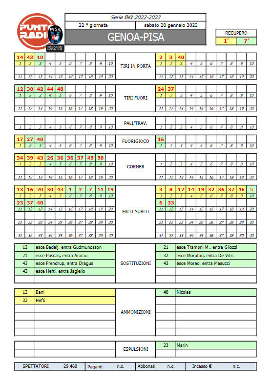 Squadre nuovamente in campo per la ripresa. Tutto pronto, nessuna sostituzione. Partiti! Nerazzurri subito aggressivi, tiene la difesa di casa. Primi cinque minuti con i nerazzurri davvero concentrati e pronti a ripartire. Bella palla recuperata in mediana da Tramoni e Pisa che ci prova al 9'. Ottimo Pisa in questo inizio di ripresa. Genoa pericoloso al 10' con Puscas, colpo di testa su cui arriva Nicolas senza problemi. Occasione Genoa all'11': Coda, al volo, di destro, incrocia fuori di pochissimo da dentro l'area. Nel Genoa Gudmundsson subentra a Badelj al 12'. Raggiunto e superato il quarto d'ora. Gooollllll Pisa al 16': Morutan tutto solo mette in porta sull'assist di un compagno. Annullato per fuorigioco. Controllo Var in corso. Gol annullato per il fuorigioco di Beruatto sul tocco di Moreo. Peccato. Pisa pericolosissimo e ancora pienamante in partita. Siamo al 19'. Al 21' sostituzione Genoa, fuori Puscas, dentro Aramu. Cambia anche il Pisa: fuori Tramoni, al suo posto Gliozzi. Eccola, l'espulsione di Marin. Arbitro protagonista al 24': fallo del rumeno che risponde al fischio del direttore di gara e doppio giallo immediato di Volpi che rovina una partita in perfetto equilibrio. Decisione assurda e da mettere subito sotto inchiesta. Pisa che aveva iniziato molto meglio dei padroni di casa e che ora dovrà giocare con l'uomo in meno. Occasionissima Genoa al 30' con Aramu: combinazione veloce con Coda e conclusione fuori di un soffio alla destra di Nicolas. Tutto era fermo per un fuorigioco. Ma ora il Genoa spinge fortissimo. Siamo al 32'. Nel Pisa De Vitis subentra a Morutan, D'angelo costretto a coprirsi al 33'. Dieci minuti più recupero alla fine del match. Angolo per i padroni di casa al 36': da destra e nuovo corner. Batte Aramu e palla che finisce in corner dall'altra parte. Genoa costantemente nella metà compo nerazzurra, difesa che per ora tiene. Gol Genoa al 40'. Bani di testa mette alle spalle di Nicolas. Gol annullato. Controllo Var in corso. Gol annullato, questione di centimetri come in occasione dell'1 a 0 annullato al Pisa. Al 43' nel Genoa Dragus al posto di Frendrup e Jeggiello per Hefti. Nel Pisa Masucci per Moreo. Angolo Genoa al 45', nerazzurri che resistono. Sei minuti di recupero, uno è già passato. Ammonito Nicolas per perdita di tempo al 49'. Corner Genoa al 50'. Un minuto di recupero addizionale e siamo a 7'. Direzione di gara davvero deprecabile. Pisa che chiude in avanti. Finisce così, Pisa che stoicamante risponde sul campo al Genoa e all'espulsione di Marin inventata dall'arbitro al 24'.