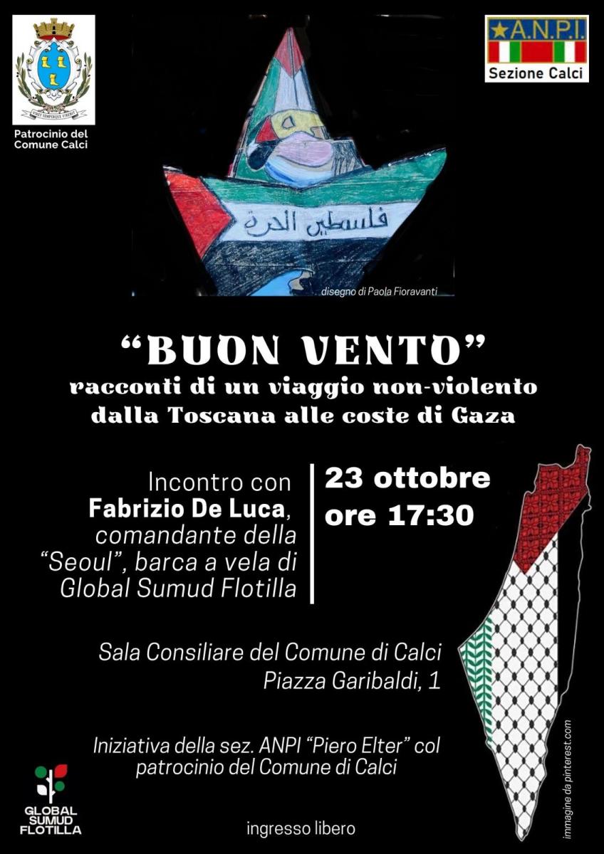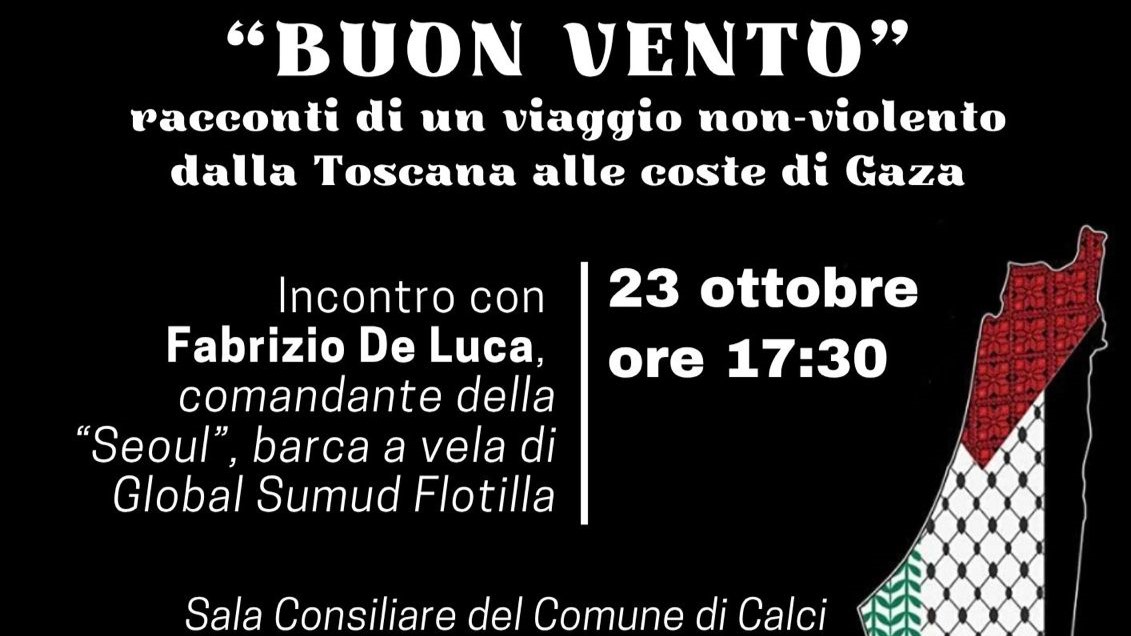 C’è un vento che soffia dal mare e porta con sé storie di coraggio, di solidarietà e di speranza. È quel vento che giovedì 23 ottobre 2025, alle 17.30, soffierà nella Sala del Consiglio Comunale di Calci, dove il comandante Fabrizio De Luca racconterà la sua esperienza a bordo della barca a vela Seul, parte della Global Sumud Flotilla.