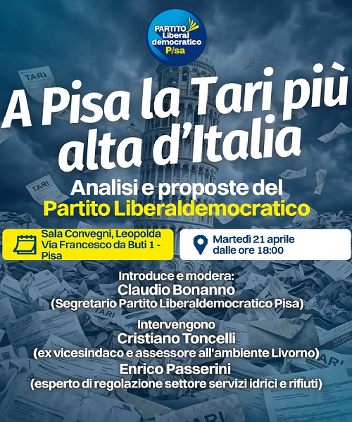 Il Partito Liberaldemocratico di Pisa invita la cittadinanza ad un incontro nel quale verrà analizzato il problema guardando sia all’evoluzione della TARI negli anni, perché purtroppo ci portiamo dietro l’eredità del passato, che ad altri e diversi aspetti che oggi incidono sulla tariffa. Lo faremo con la collaborazione di esperti del settore, senza la volontà di trovare capri espiatori, ma con l’attenzione necessaria a considerare un problema complesso. Questo per noi è il primo passo per studiare soluzioni concrete, non ci interessa lanciare slogan da propaganda, ma trovare risposte adeguate.