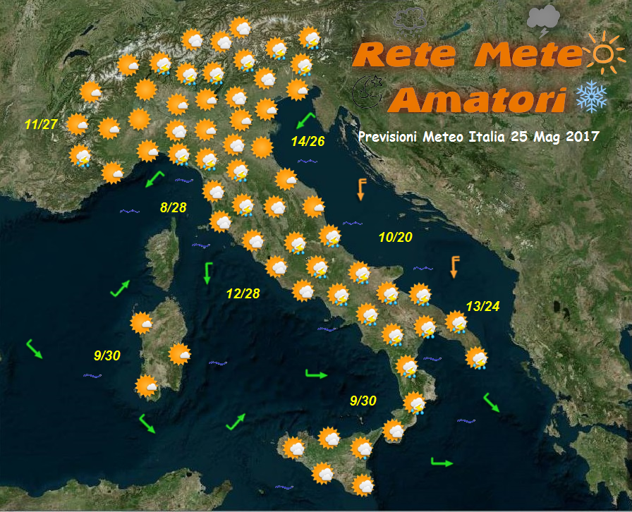 Rapido peggioramento tra Emilia Romagna orientale e regioni adriatiche del centro e del sud con interessamento dapprima di Umbria e zone interne di Toscana e Lazio e successivamente anche di gran parte del meridione eccezion fatta per la Calabria centro-meridionale e la Sicilia. Attese precipitazione convettivi almeno di moderata entità tra Marche, Abruzzo, Molise al primo mattino in rapida estensione a Puglia, Basilicata ed entroterra campano. Intensificazione dei venti soprattutto in area adriatica inizialmente di provenienza orientale per poi assumere componente settentrionale.