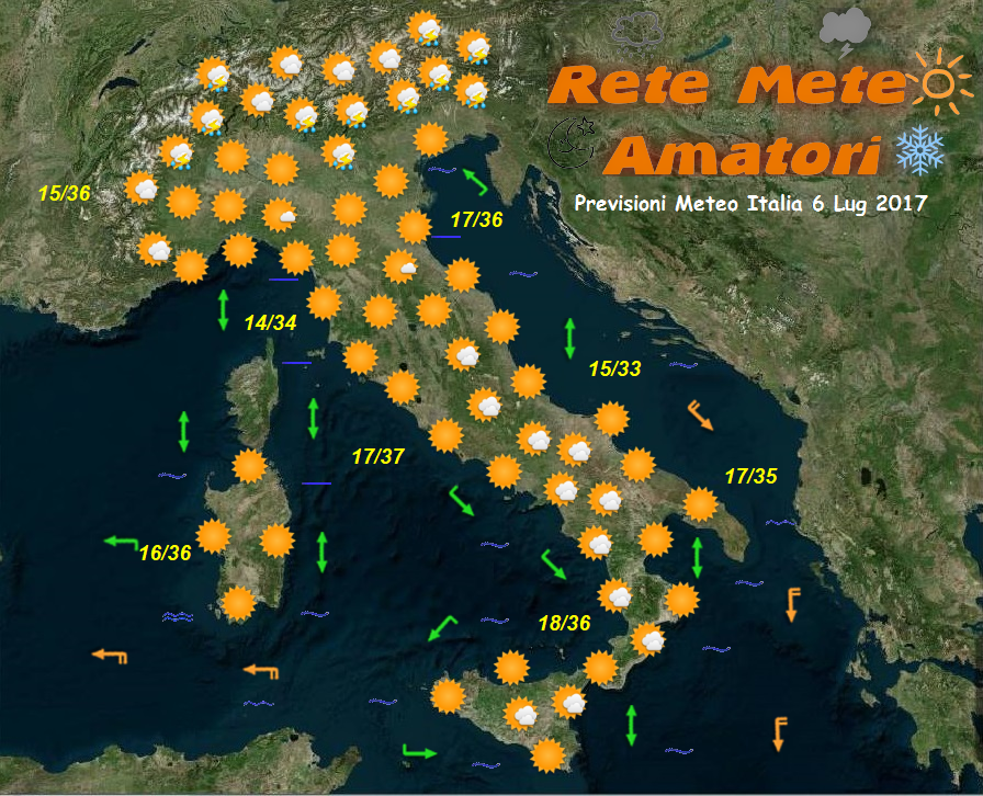 Al sud e sulla Sicilia ampio soleggiamento, con i consueti annuvolamenti ad evoluzione diurna sulle aree appenniniche peninsulari, in grado di dar luogo a qualche isolato piovasco pomeridiano sui rilievi campani e su quelli calabro-lucani; dalla serata dissolvimento della nuvolosità con cielo sereno, eccezion fatta per le aree costiere tirreniche calabresi dove è attesa la formazione di locali addensamenti bassi e stratificati. Condizioni di onda di calore su Pianura Padana, coste tirreniche centrali, Puglia, Basilicata ed isole maggiori.