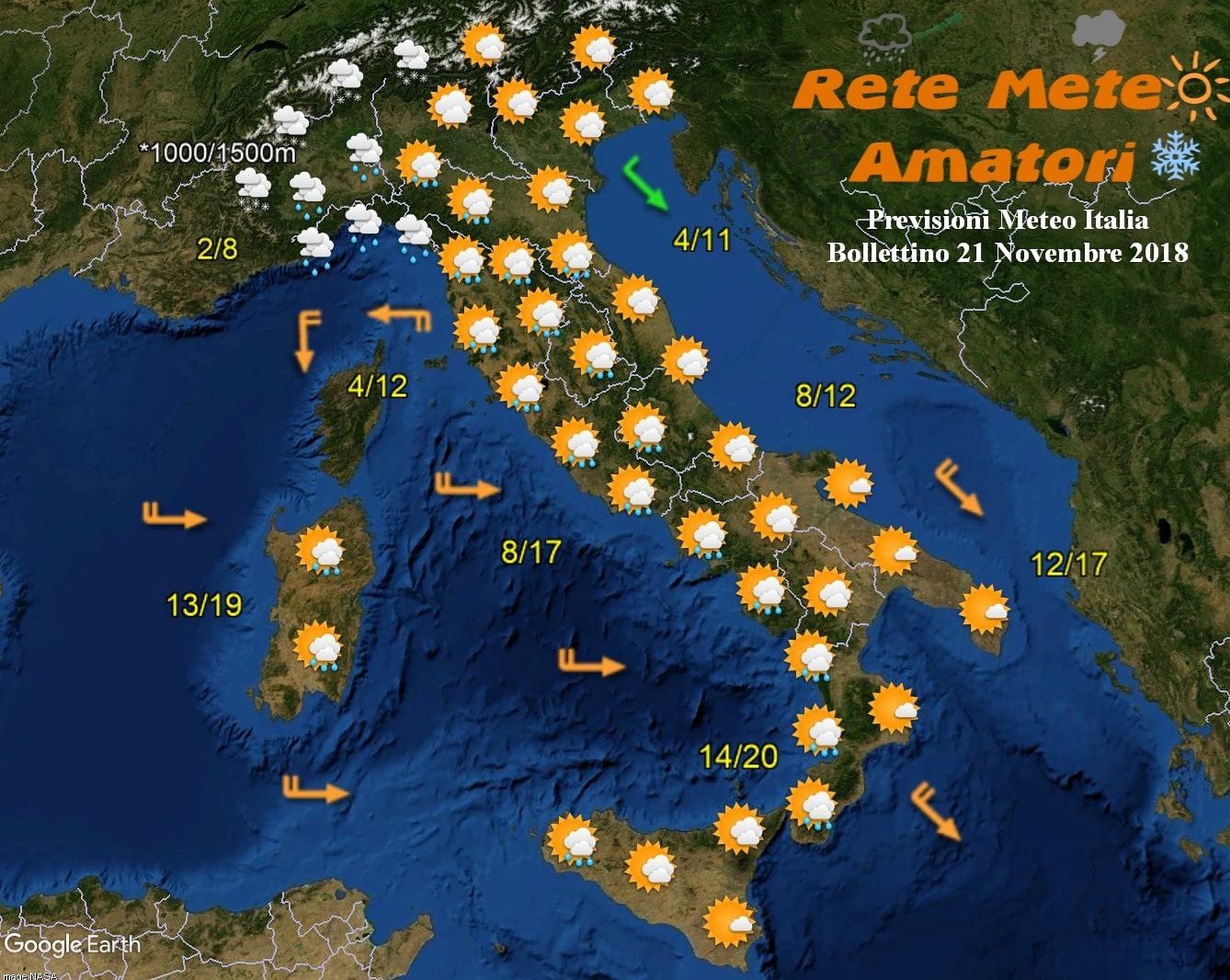 In Italia la giornata di mercoledì vedrà nebbie e nubi basse al Nord-Est, al primo mattino. Nuvoloso con deboli precipitazioni al Nord ovest, in Sardegna e sui settori tirrenici.