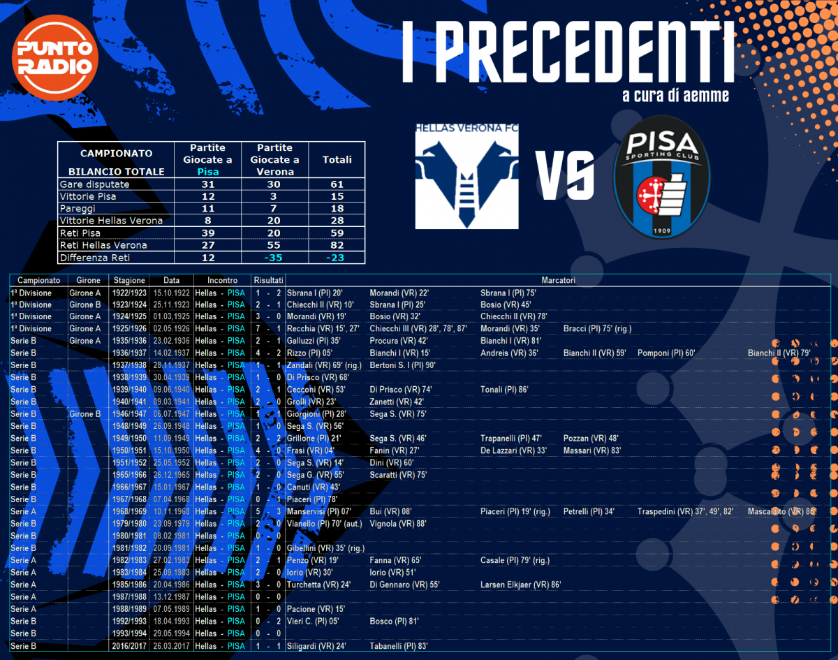 Ben tre i precedenti al Bentegodi dove non si gioca però da quasi un decennio. Il Pisa ha vinto tre volte, l'ultima nel 1993, vide a segno anche Bobo Vieri in una delle uniche due reti segnate in nerazzurro. Il bilancio si completa con venti sconfitte e sette pareggi, incluso l'ultimo che porta la firma di Tabanelli, bravo a pareggiare la rete in apertura di Siligardi. In serei A si è giocato sei volte ed il Pisa ha collezionato cinque sconfitte ed un solo pareggio.