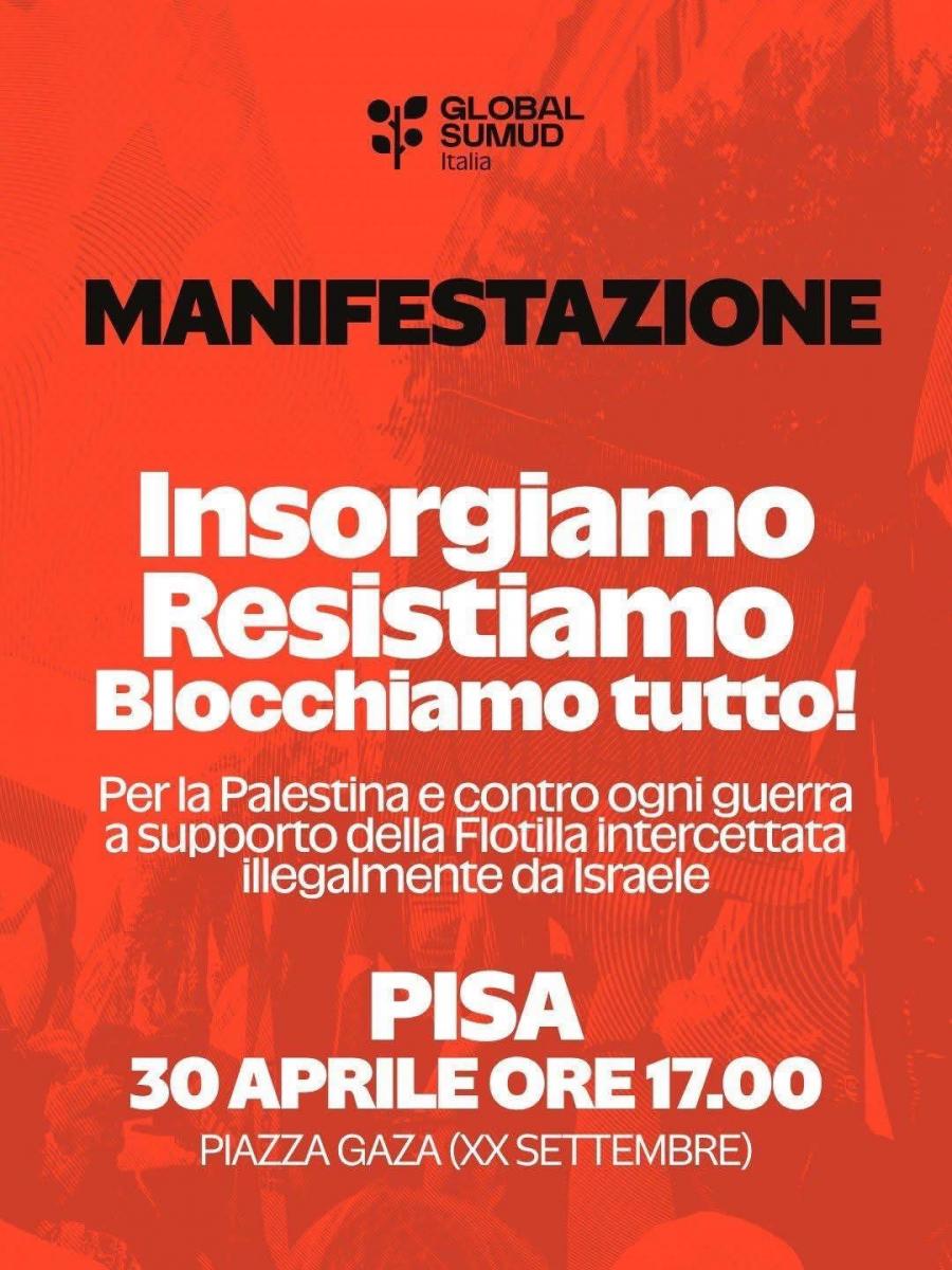 Si svolge oggi, giovedì 30 aprile, a Pisa una manifestazione convocata da associazioni e collettivi locali in relazione agli sviluppi che coinvolgono la “Global Sumud Flotilla”, diretta verso la Striscia di Gaza e intercettata al largo di Creta dalla marina israeliana.