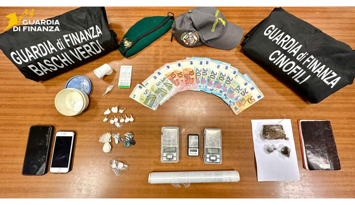 La successiva perquisizione domiciliare, eseguita anche con l’ausilio delle unità cinofile antidroga “Neva”, “Malibu’” e “Milord”, consentiva di rinvenire 15 involucri contenenti cocaina per un peso complessivo di 12,52 grammi e 3 involucri contenenti hashish per un totale di 77,50 grammi, occultati in diverse parti dell’abitazione, tra cui all’interno di un deumidificatore e di una scarpiera. Nel corso delle ulteriori ricerche sono stati inoltre sequestrati bilancini di precisione e materiale per il confezionamento delle dosi.