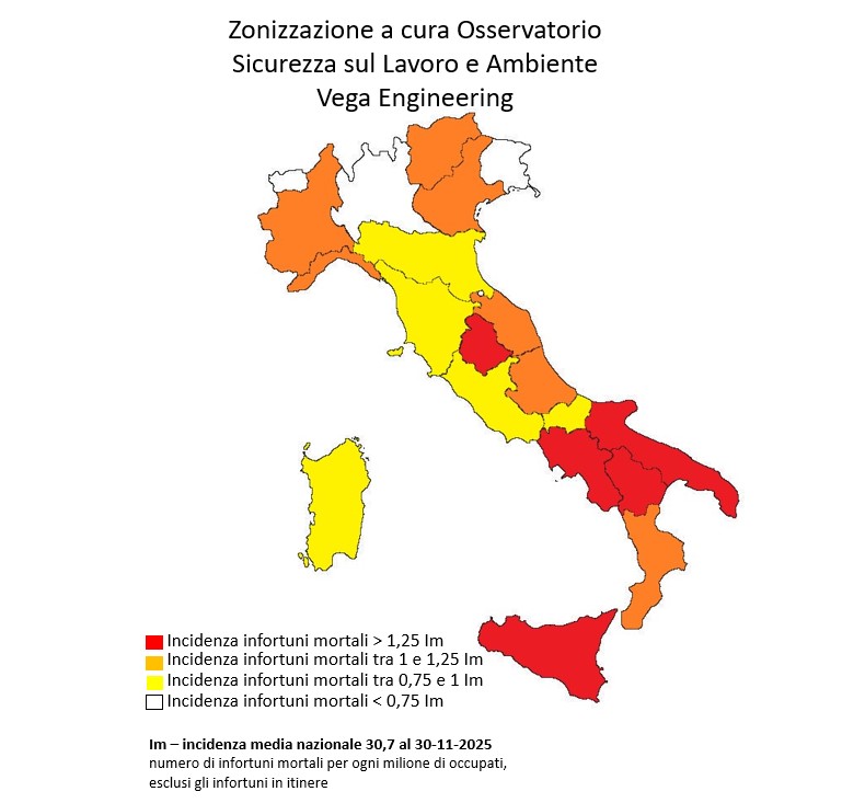 A finire in zona rossa a dicembre 2025, con un’incidenza superiore a +25% rispetto alla media nazionale (Im=Indice incidenza medio, pari a 33,3 morti sul lavoro ogni milione di lavoratori) sono: Basilicata, Campania, Umbria, Puglia, Sicilia e Marche. In zona arancione: Liguria, Calabria, Piemonte e Veneto. In zona gialla: Trentino-Alto Adige, Emilia-Romagna, Abruzzo, Sardegna, Toscana e Molise. In zona bianca: Lazio, Lombardia, Friuli-Venezia Giulia e Valle d’Aosta.