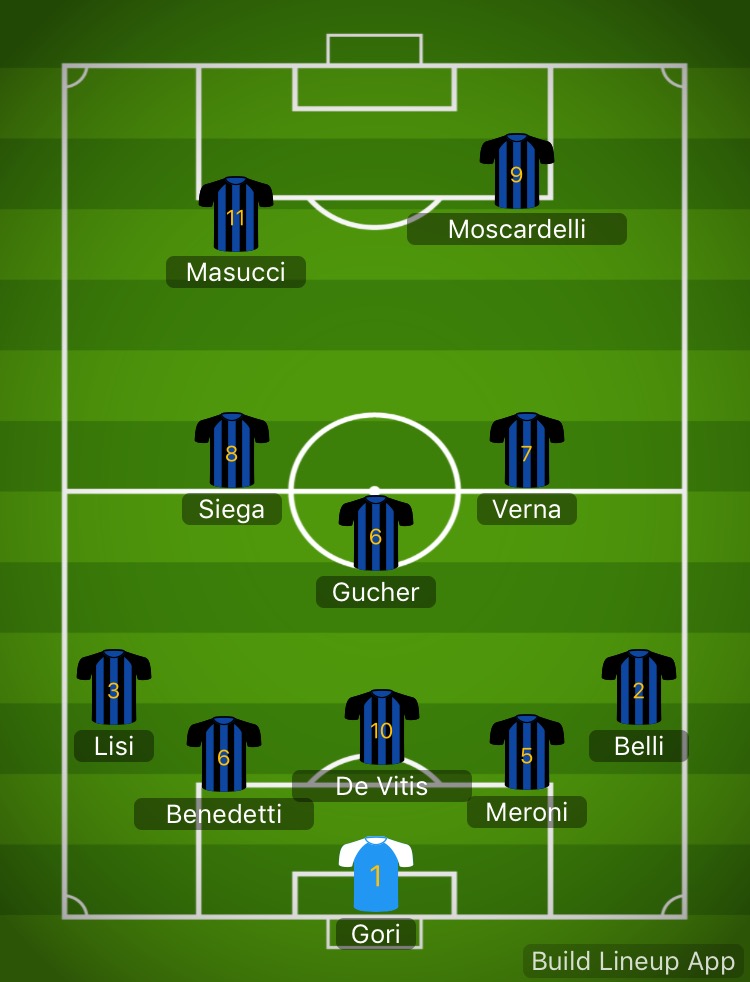 Le indicazioni arrivate dopo il test di giovedì scorso contro il Montecatini, lascerebbero intendere che mister Luca D’Angelo sia intenzionato a schierare un Pisa con la difesa a tre ecosì, stante la squalifica di Meroni, la linea arretrata potrebbe essere composta da Benedetti, De Vitis e Aya, esterno destro Belli, a sinistra Lisi. Per quanto riguarda il centrocampo con Gucher centrale potrebbero esserci Verna mezzala destra e Siega mezzala sinistra. In avanti Moscardelli – Masucci è la coppia più probabile, in attesa di vedere, magari a partita in corso anche in nuovo acquisto Asencio. Nella formazione alla sinistra i numeri dei giocatori nerazzurri sono puramente indicativi, al momento della pubblicazione la società non ha ancora comunicato la lista provvisioria con la nuomerazione delle maglie
