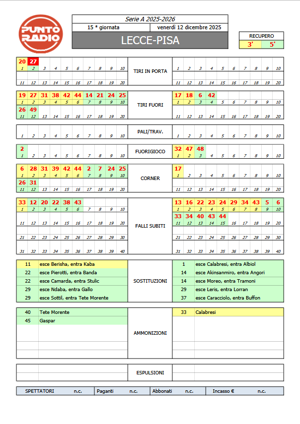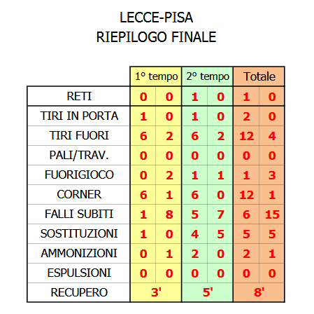 Buonasera, tutto pronto per Lecce-Pisa, match valido per la 15a giornata di serie A. Squadre in campo, Pisa in maglia nerazzurra. Partiti! Al 7' Pisa che sfonda in verticale con Meister fermato sul più bello. Partita in equilibrio e senza grande emozioni. Siamo al 9': nel Lecce si fa male Berisha. Calciatore pugliese accompagnato fuori dal campo in barella. Al suo posto, all'11' subentra Kaba. Al 17' angolo Pisa: da destra va Aebischer per Moreo e colpo di testa sul primo palo del nerazzurro fuori. Al 19' errore di Canestrelli in fase di costruzione e Coulibaly, dal limite spara alto. Ancora Lecce al 21' e Semper para a terra sulla conclusione debole di Pierotti. Meglio i padroni di casa in questo momento. Raggiunto e superato il 25'. Angolo Lecce al 27': da sinistra va Sottil e doppia occasione per i padroni di casa. Tiene sulla linea di porta il Pisa che ribatte almeno due conclusioni consecutive, la prima con Semper. Alla mezz'ora nerazzurri in difficoltà in fase di costruzione (almeno tre volte). Corner regalato dalla terna al Lecce al 31' e nuova occasione per i padroni di casa sullo sviluppo dell'angolo. Ammonito Calabresi al 33' che trattiene Sottil ripetutamente. A meno di dieci minuti dalla fine del primo tempo, Pisa non ancora capace di fare male in contropiede. Nuovo corner Lecce al 39': ribatte la difesa nerazzurra. Al 42' ennesimo errore dei nerazzurri in fase di ripartenza. Quinto corner Lecce al 42'. Calcio d'angolo per i padroni di casa (sesto) al 44' e sul taglio da sinistra di Sottil, Tiago Gabriel, di testa, mette sul fondo. 3 minuti di recupero. Finisce così, squadre al riposo sullo 0 a 0.