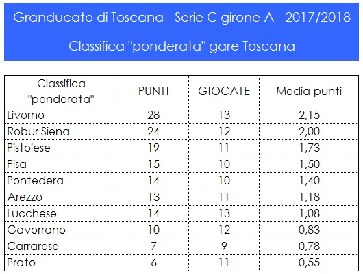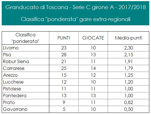 Vediamo anche la differenza di comportamento, con la classifica ponderata, per le squadre toscane nelle gare contro le cugine, messa a confronto con la classifica delle gare con squadre extra-regione: