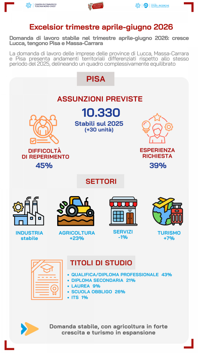 del Sistema Informativo Excelsior, realizzate da Unioncamere in collaborazione con la Camera di Commercio della Toscana Nord-Ovest, tra aprile e giugno 2026 le imprese del territorio prevedono l’ingresso di 10.330 unità, un dato in linea con quanto registrato nello stesso periodo dello scorso anno.