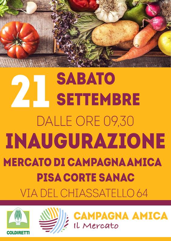 Sabato 21 settembre, alle ore 9:30 si terrà l'inaugurazione della nuova sede del mercato di Campagna Amica, alla corte Ex Sanac (via del Chiassatello 64, Pisa).