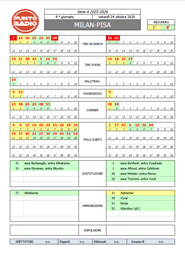 Buonasera, tutto pronto per Milan-Pisa, match valido per l'8a giornata di serie A. Squadre in campo, Pisa in bianco, con la nuova maglia (che celebra lo storico logo) presentata qualche giorno fa. Partiti! Sette minuti e gol Milan, Leao, da sinistra infila alle spalle di Semper con una conclusione a giro sul secondo palo. 1-0. Sul gol milanista, resta quelche dubbio sul fuorigioco di un calciatore avversario non segnalato. Buon Pisa al 12', Tramoni sfonda a destra e dal fondo scarica a centro area, dove non trova nessun compagno. Angolo Pisa al 18': da destra va Aebischer, la difesa ribatte e Bonfanti calcia fuori in diagonale di prima intenzione. Ci prova ancora Leao al 21': destro a botta sicura da dentro l'area deviata in corner da un nerazzurro. Akinsanmiro al 25' mette alto al termine di una buona azione nerazzurra. Dopo l'1 a 0, i nerazzurri provano a tenere testa alla capolista. Ammonito Aebischer al 31' per gioco scorretto su Leao. Milan pericolosissimo al 33': Leao riceve in area sulla smanacciata in difficoltà di Semper, poi l'azione sfuma. Rischio autogol al 38', Bonfanti in ripiegamanto colpisce la palla verso la porta difesa da Semper che finisce in angolo. Meno di cinque minuti più recupero alla fine del primo tempo. 1 minuto di recupero. Finale di marca rossonera, tiene il fortino nerazzurro. Finisce così, squadre al riposo sul minimo scarto.