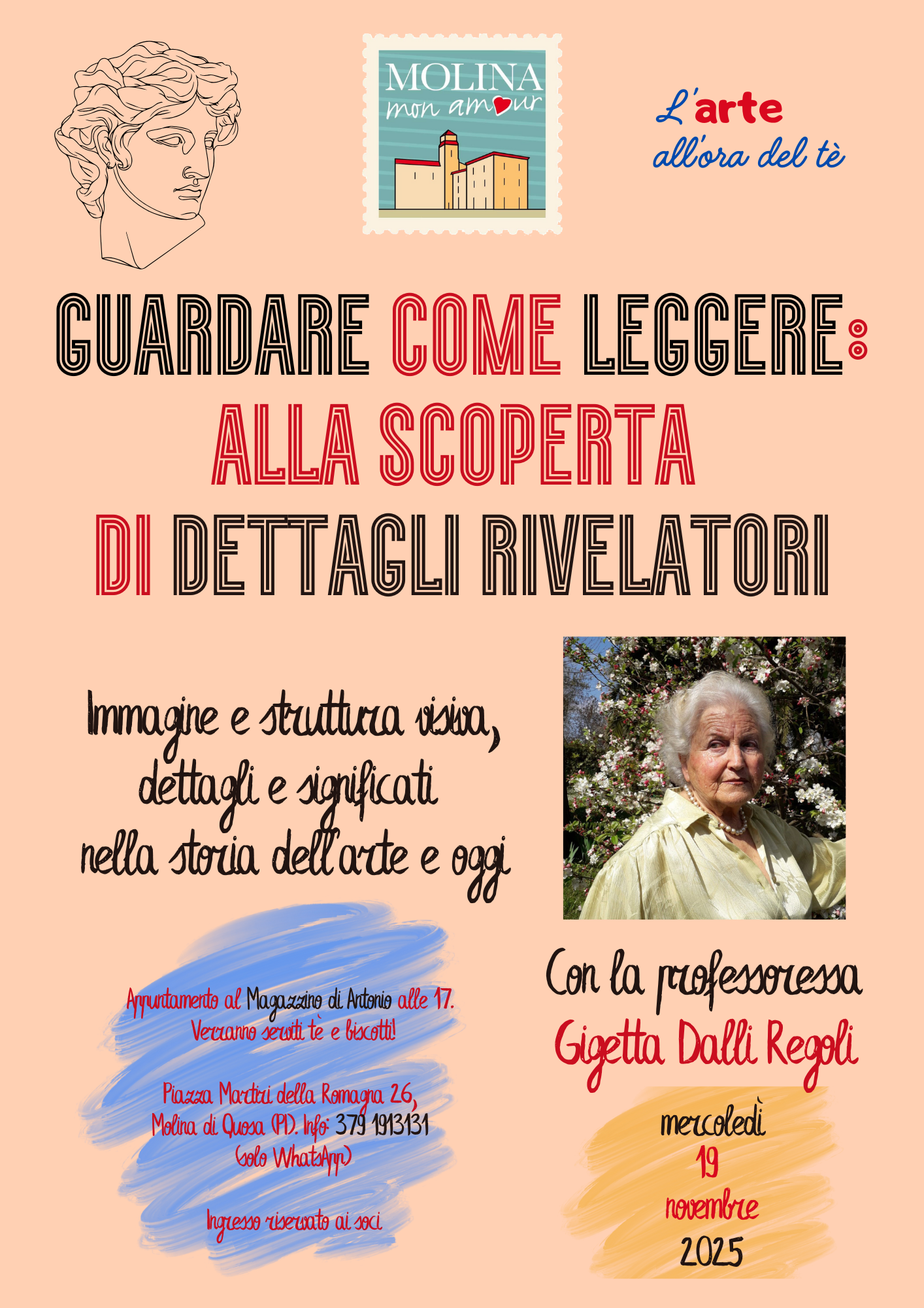 Appuntamento alle 17, ingresso riservato ai soci (è possibile tesserarsi in loco). Mercoledì 19 novembre toccherà alla professoressa Gigetta Dalli Regoli inaugurare la rassegna. Nel suo incontro dal titolo "Guardare come leggere: alla scoperta di dettagli rivelatori", la professoressa parlerà di immagini e struttura visiva, tra dettagli e significati, con l'aiuto di opere d'arte note e meno note.