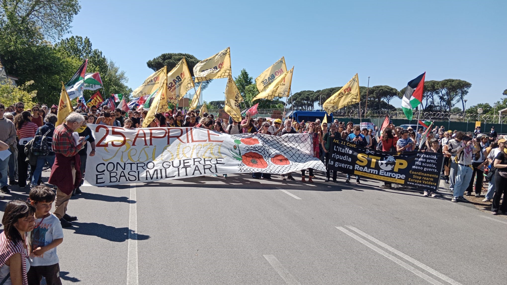Circa 500 persone hanno preso parte, nella mattinata del 25 aprile, a una manifestazione svoltasi nei pressi di Camp Darby, dove i partecipanti hanno sfilato in corteo per chiedere la chiusura della struttura militare statunitense. L’iniziativa è stata organizzata dal Movimento No Base, realtà riconducibile all’area della sinistra radicale.