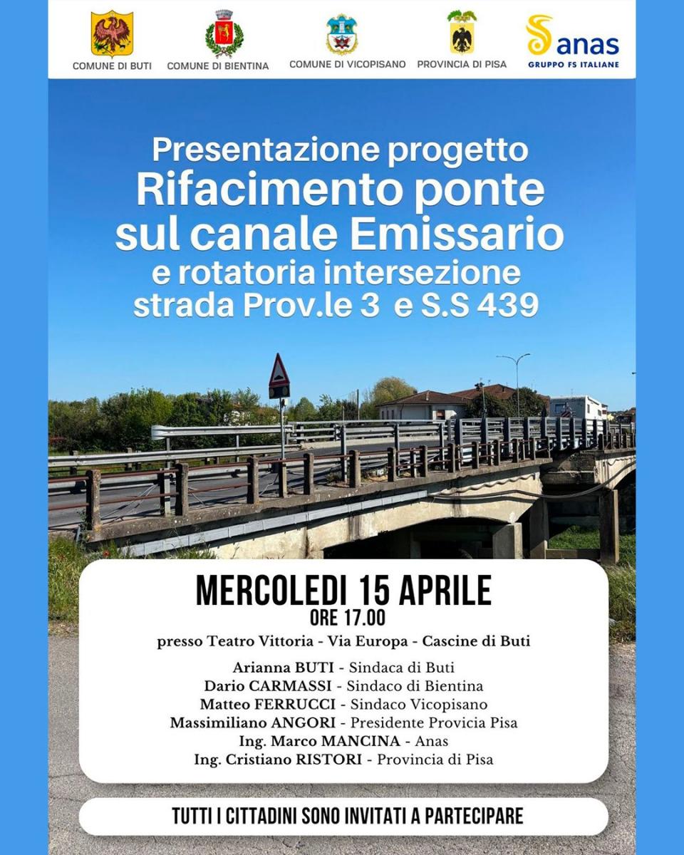 Sarà presentato mercoledì 15 aprile alle ore 17, al Teatro Vittoria di Cascine di Buti, il progetto per la realizzazione del nuovo ponte sul Canale Emissario e della rotatoria destinata a sostituire l’attuale impianto semaforico in località Guerrazzi, al confine tra i comuni di Vicopisano e Bientina.