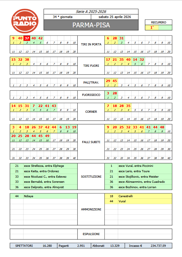 PISA SC (3-5-2): Semper; Bozhinov (36' st Lorran), Caracciolo, Canestrelli; Akinsanmiro (35' st Cuadrado), Vural, Leris (21' st Touré), Aebischer, Angori; Stojikovic (21' st Meister), Moreo. All. Hiljemark.