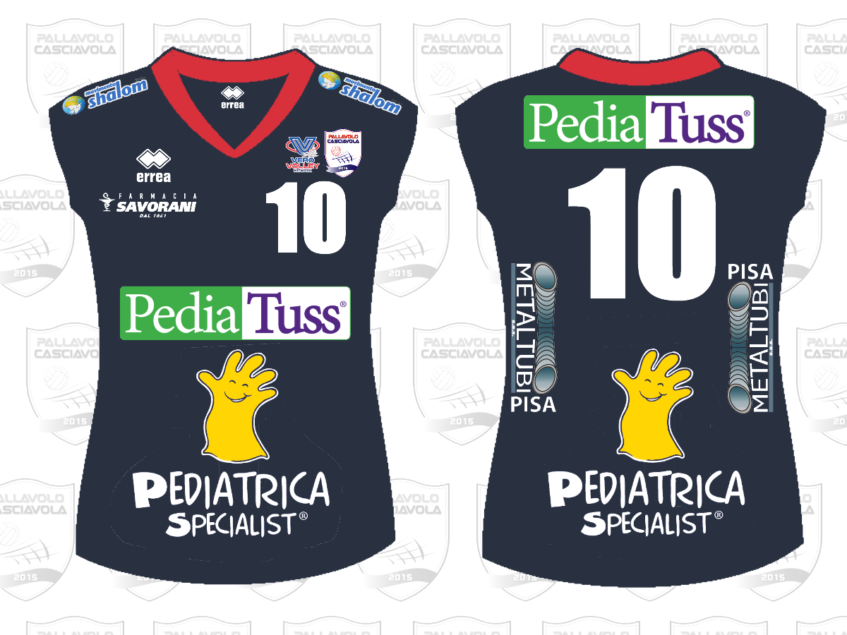 Una maglia in linea con la tradizione degli ultimi anni, un completo blu, firmato Errea e personalizzato come sempre dal nostro fornitore tecnico la RGM che si trova in Via dei Condotti a Ghezzano. Dicevamo, una maglia in linea con la tradizione, colletto a V rosso, sponsor PediaTuss con l’inconfondibile “manina” gialla marchio di fabbrica di Pediatrica Specialist, ma non mancano alcune piccole ma significative novità: a partire dal logo sociale, ridisegnato durante il periodo di lockdown e già ben presente sui nostri canali social, che adesso debutta anche su una divisa da gioco ed al suo fianco per la prima volta anche il marchio Vero Volley Network arrivato sulle divise rossoblù dopo l’accordo sottoscritto con il club brianzolo nella seconda metà del mese di luglio. Sulla parte frontale della maglia trovano posto anche il logo della Farmacia Savorani, proprio sotto lo sponsor tecnico e quello del Movimento Shalom che da quest’anno "trasloca" su entrambe le spalle delle giocatrici. Passando al backfront, nella parte alta ancora il marchio PediaTuss, con il logo e la scritta Pediatrica Specialist in basso, e l’altro nostro prezioso sponsor Metaltubi che, come nella passata stagione, prende posto in verticale a destra e a sinistra del numero.