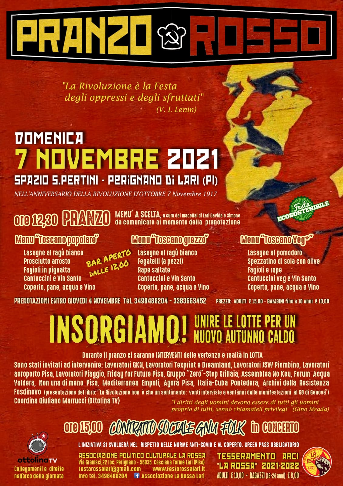 Domenica 7 novembre alle ore 12.30 nello spazio al coperto del parco Pertini in via Risorgimento a Perignano di Lari (PI), torna il Pranzo Rosso