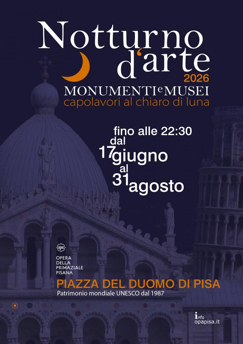 Cattedrale, Torre, Battistero, Camposanto, Museo dell'Opera e Museo delle Sinopie accessibili ogni sera d'estate. L'Opera della Primaziale Pisana lancia un modello inedito: non una notte straordinaria, ma un palinsesto serale continuativo per tutta l'estate.